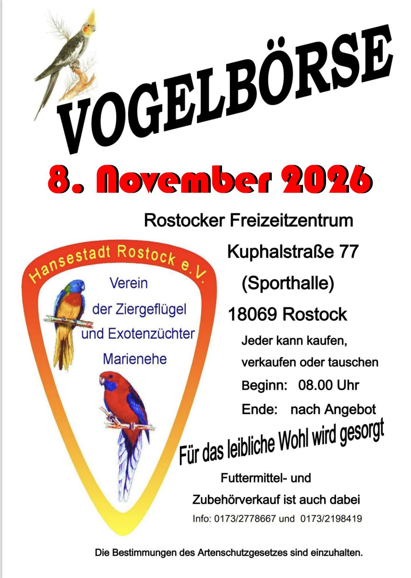 Am Sonntag, den 8. November 2026, findet unsere vierte und damit letzte Vogelbörse in diesem Jahr statt, wie immer im Rostocker Freizeitzentrum in der Kuphalstraße 77. Jeder Interessierte kann kaufen, verkaufen oder tauschen oder einfach nur mit erfahrenen Züchtern und Haltern fachsimpeln.