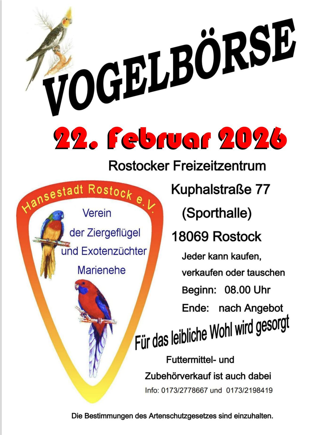 Am Sonntag, den 22. Februar 2026, findet unsere erste Vogelbörse in diesem Jahr statt, wie immer im Rostocker Freizeitzentrum in der Kuphalstraße 77. Jeder Interessierte kann kaufen, verkaufen oder tauschen oder einfach nur mit erfahrenen Züchtern und Haltern fachsimpeln.