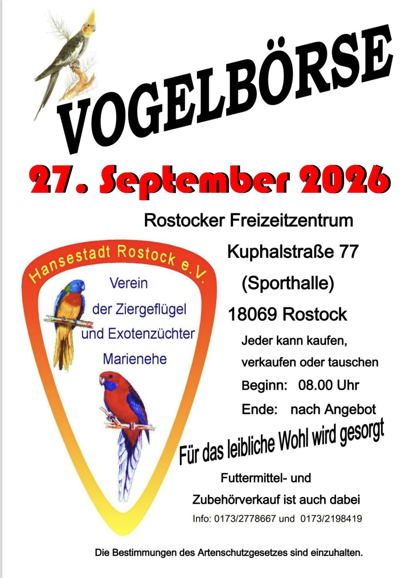 Am Sonntag, den 27. September 2026, findet unsere dritte Vogelbörse in diesem Jahr statt, wie immer im Rostocker Freizeitzentrum in der Kuphalstraße 77. Jeder Interessierte kann kaufen, verkaufen oder tauschen oder einfach nur mit erfahrenen Züchtern und Haltern fachsimpeln.